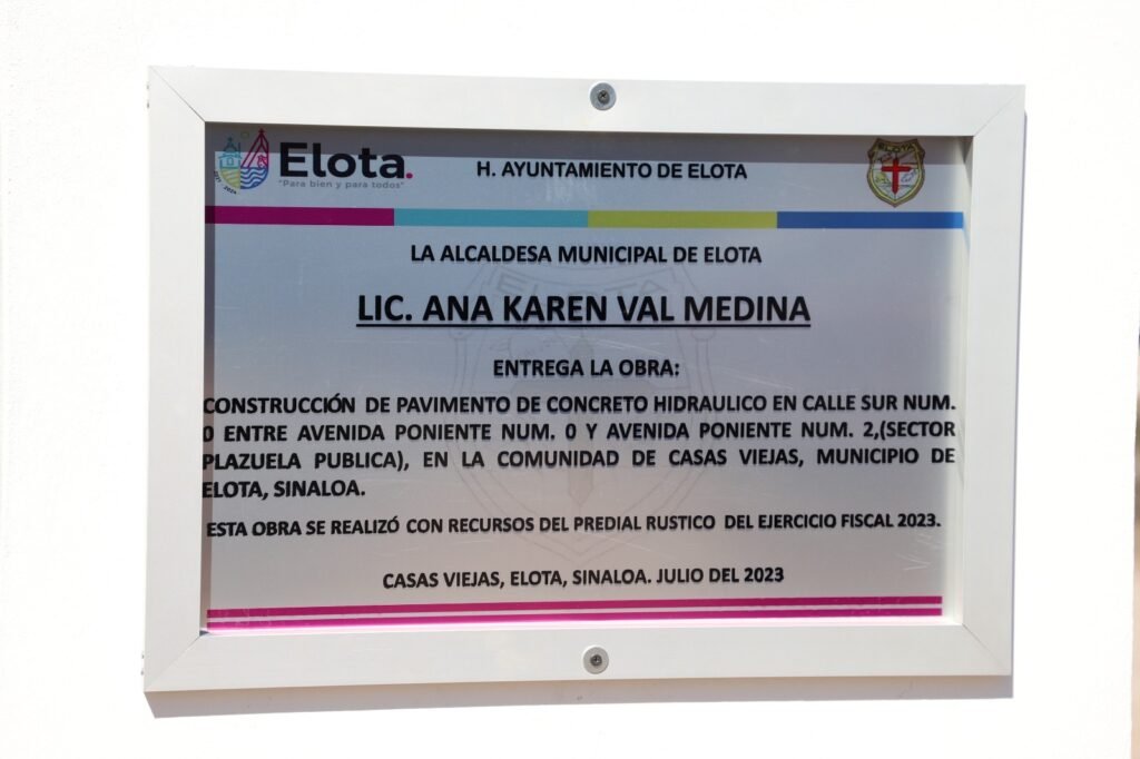 Casas Viejas, Elota, Sinaloa.- En gira de trabajo, la presidenta municipal de Elota, Ana Karen Val Medina, hizo entrega de una techumbre metálica en el jardín de niños John Dewey y la pavimentación de la calle Sur Número 0 del sector plazuela, ambas en la comunidad de Casas Viejas.